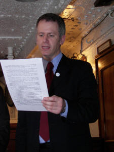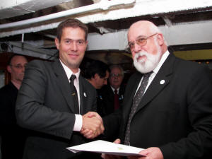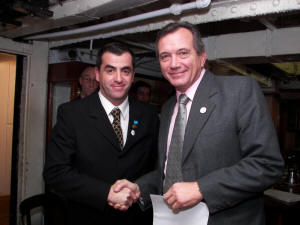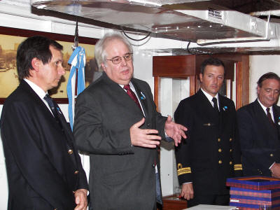 1) El Presidente de la ASOCIACIÓN HONORARIA DE SALVAMENTOS MARÍTIMOS Y FLUVIALES - ADES - Republica Oriental del URUGUAY, Sr. Dennis GEORGEOGLOU, nos obsequio una placa Institucional con la flota de Salvamento de ADES, con una placa con la siguiente inscripción : "ADES en la celebración del acto fundacional DE LA NACIÓN MARÍTIMA ASOCIACIÓN CIVIL, con nuestro mayor augurio de éxito en su misión. Buenos Aires - 7 de Julio de 2006". El Presidente de ADES, Sr. Dennis AGEORGEOGLOU, tomo la palabra dirigiendo su discurso a los presentes, lo cual sumo emotividad al momento. |